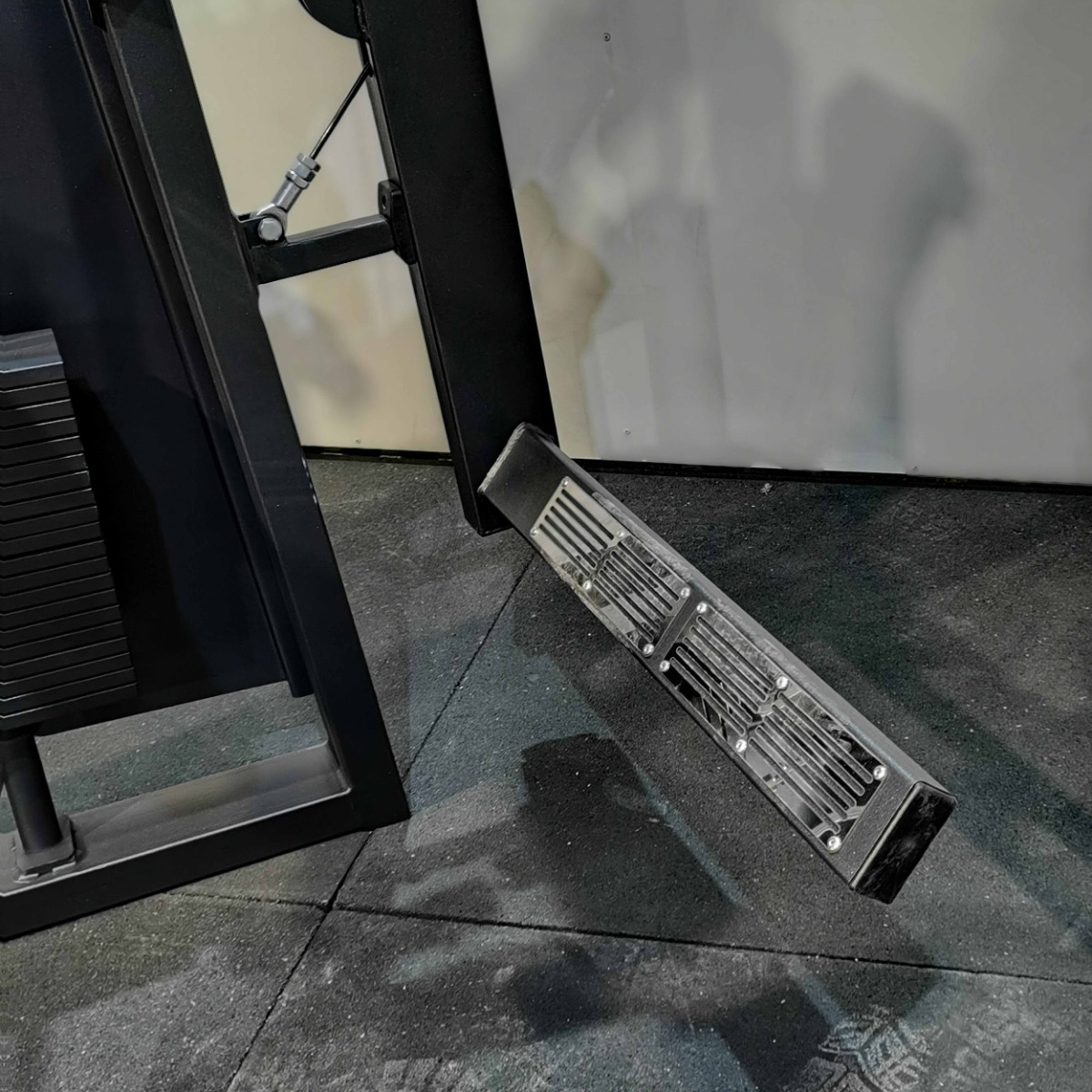 Платформа для опоры ноги на подвижном рычаге защищена двойными металлическими пластинами с рифлёной поверхностью, предотвращающей скольжение.