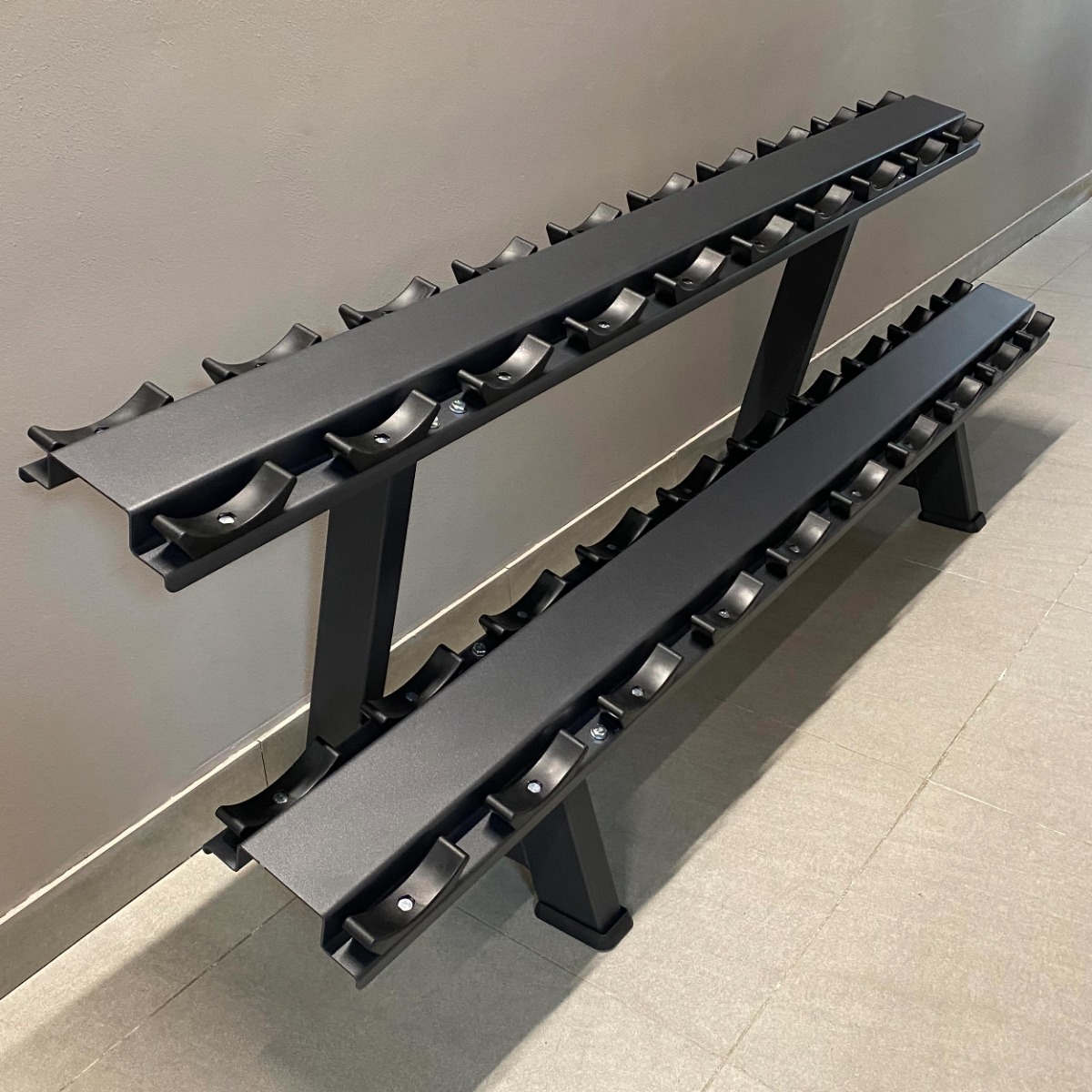 На каждой полке установлены чашеобразные пластиковые ложементы (всего 40 шт.), обеспечивающие надёжную фиксацию гантелей и предотвращающие повреждение поверхности полок.