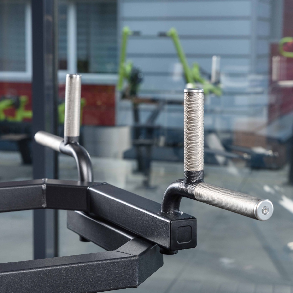 На каждом рычаге установлены две рукояти – вертикальная и горизонтальная. Вертикальные рукояти длиной 115 мм предназначены для акцентированной проработки трапециевидных мышц, горизонтальные рукояти длиной 150 мм – для изолированной нагрузки на задние пучки дельтовидных. Диаметр рукоятей 30 мм, рабочие зоны покрыты мягкой ромбовидной накаткой. Торцы оборудованы металлическими заглушками, зафиксированными болтовым соединением.