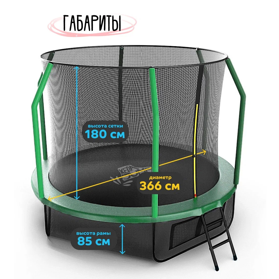 Прочная рама оцинкована и окрашена черной порошковой краской. Батут стоит на четырех крепких W-образных опорах. Чтобы на батут было удобно забираться, предусмотрена крепкая лестница.