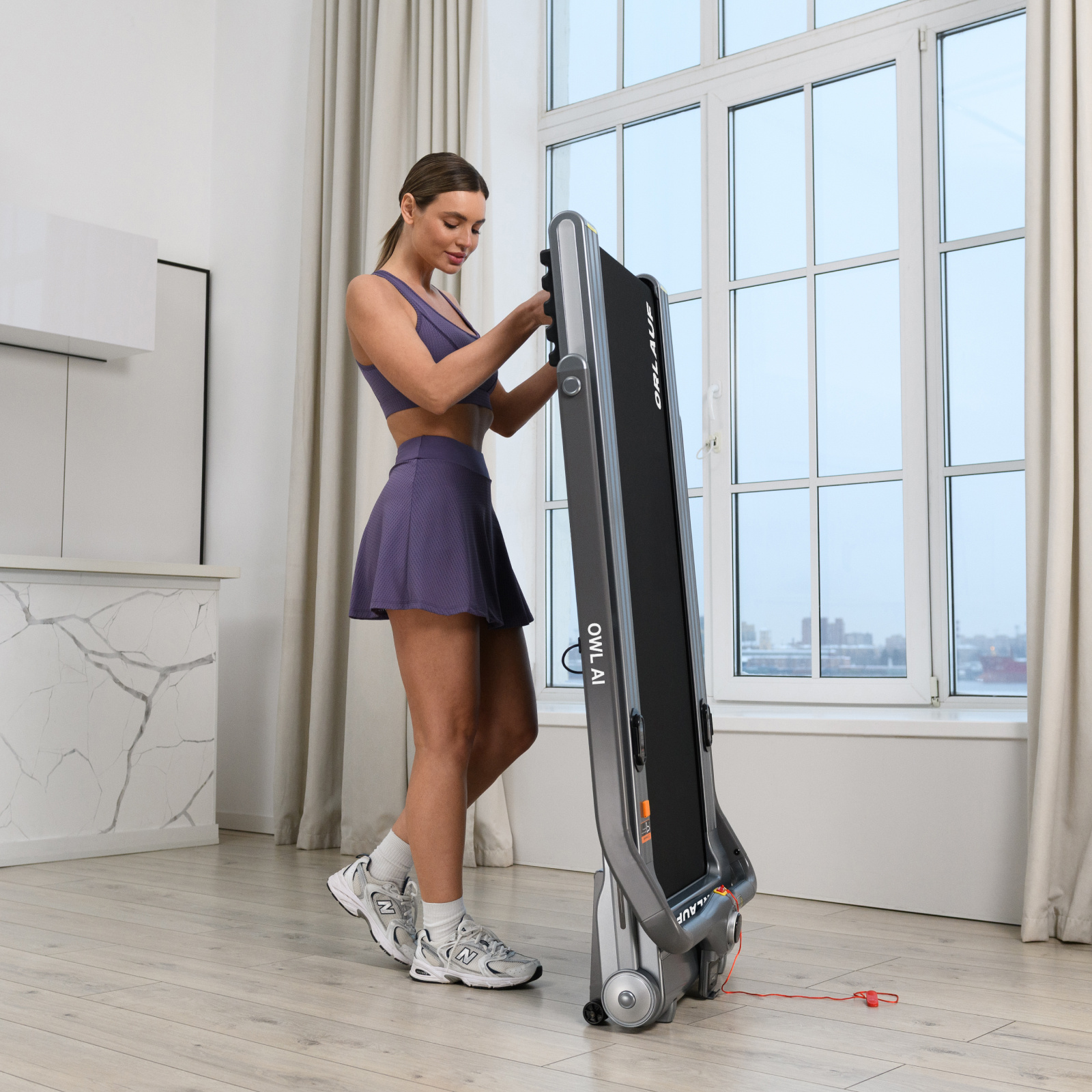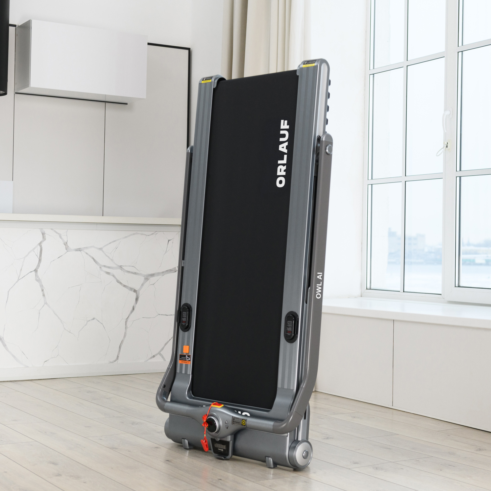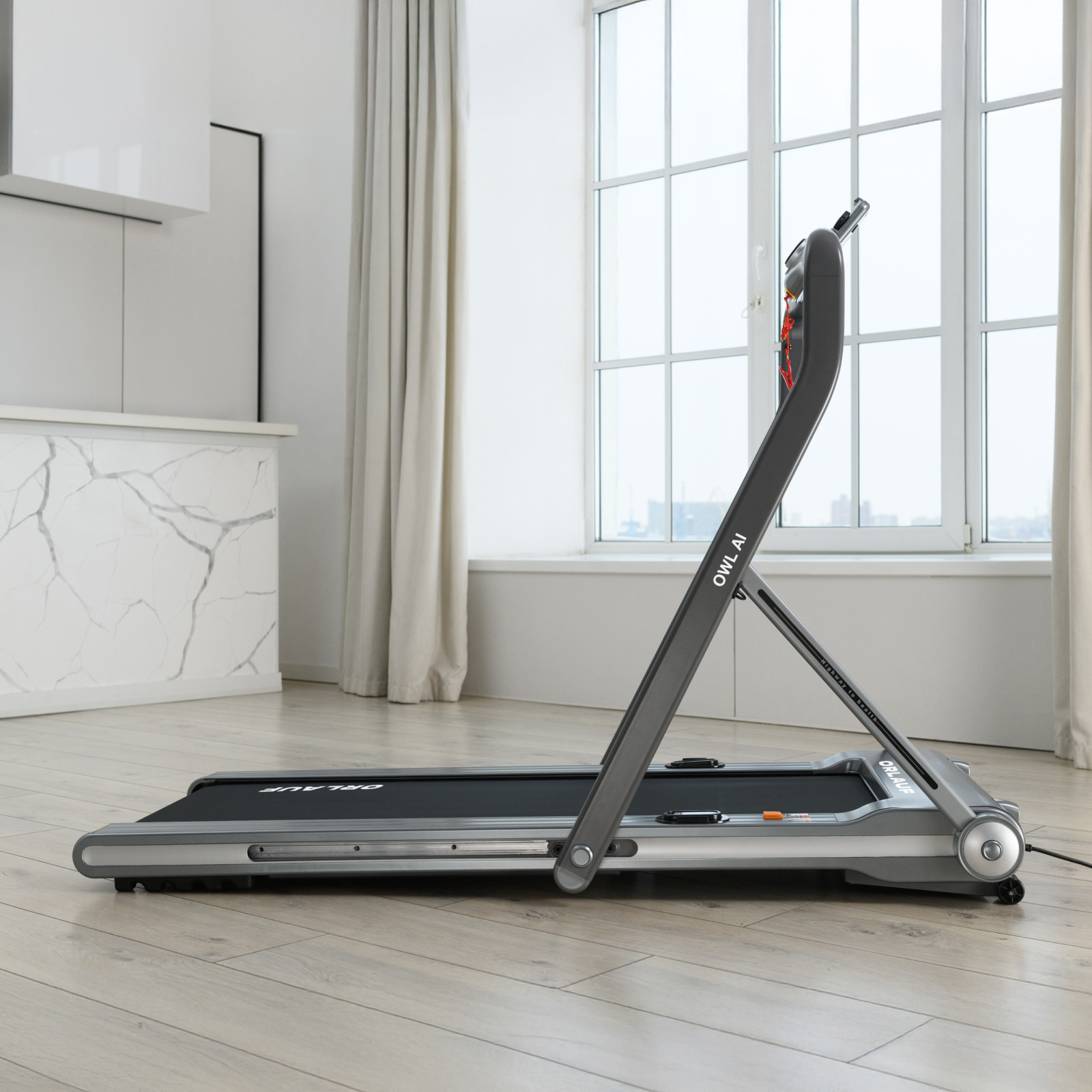 Электрическая беговая дорожка Orlauf Owl AI – это компактное решение для домашних тренировок. Модель отличается удобной системой складывания Click-Clack™, позволяющей быстро трансформировать дорожку одним движением. В сложенном виде толщина составляет всего 21 см, что обеспечивает удобное хранение как в горизонтальном, так и в вертикальном положении.