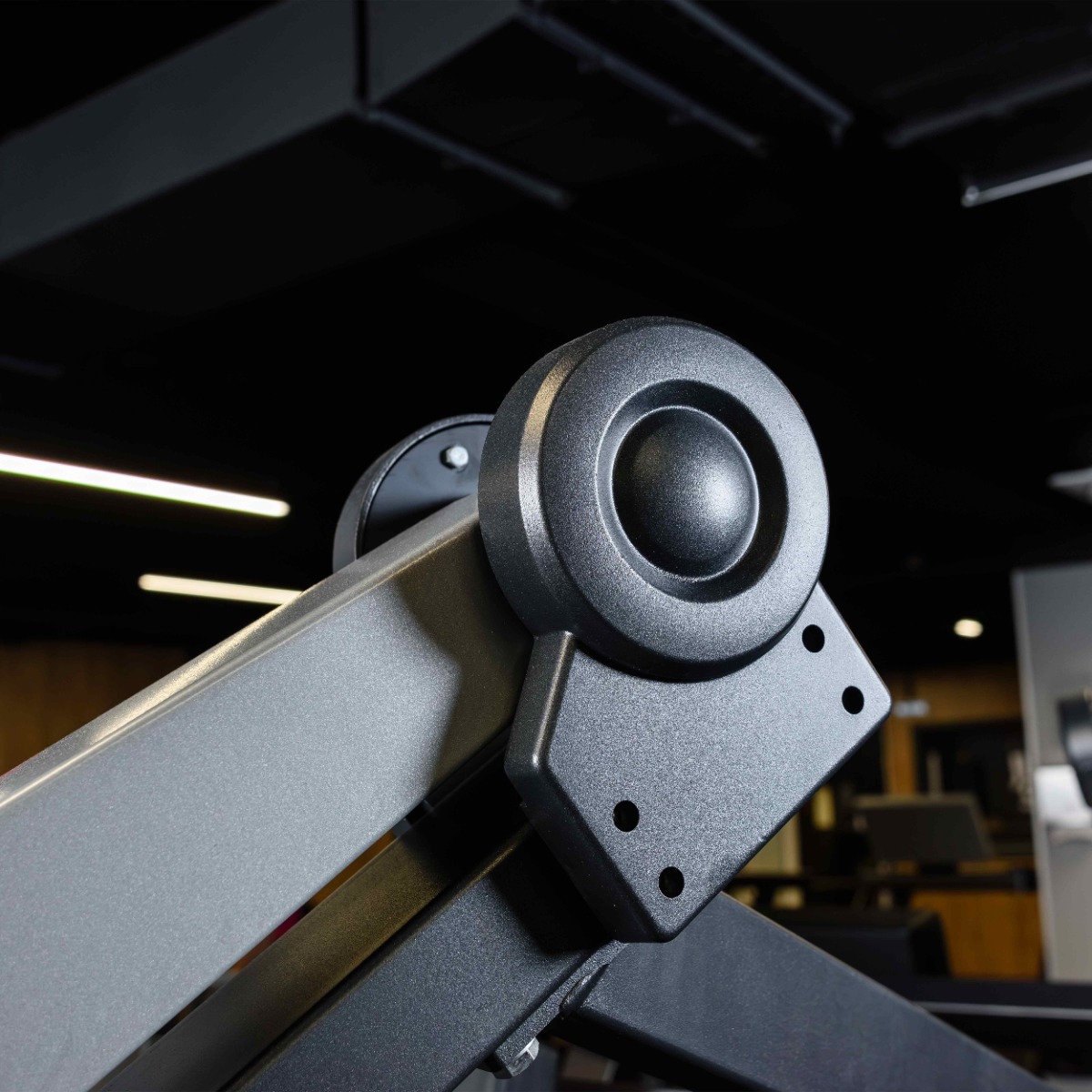На подвижных рычагах для работы со свободными весами установлено два литых хромированных накопителя из толстостенной стальной трубы длиной 265 мм (рабочая длина 235 мм без учета заглушек и демпферов) для дисков с посадочным диаметром 50 мм. На торцах при помощи болтов закреплены металлические заглушки.
