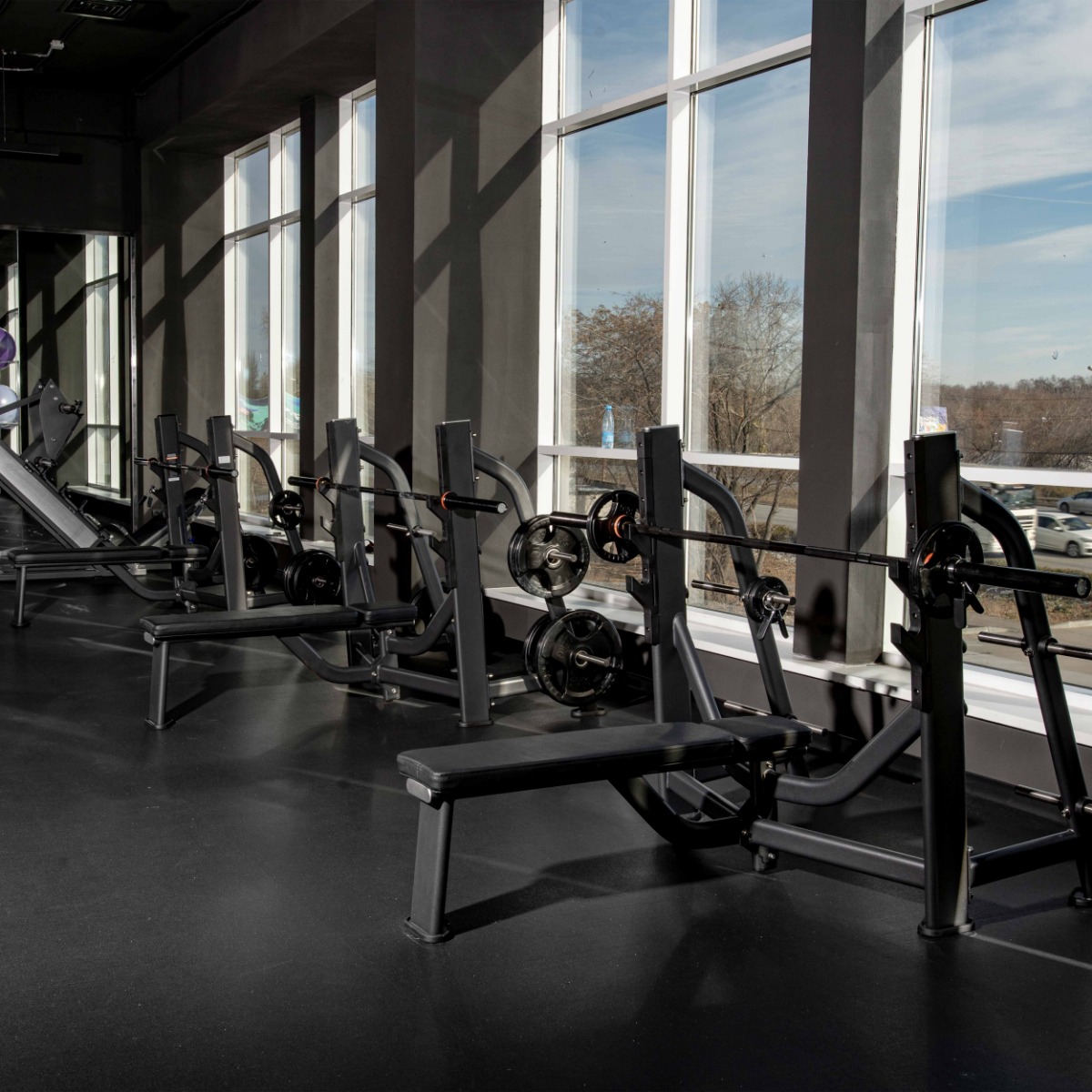 На раме закреплено восемь металлических накопителей для хранения свободных весов, оборудованных кольцами из плотной резины для предотвращения механических повреждений при соприкосновении дисков с рамой.