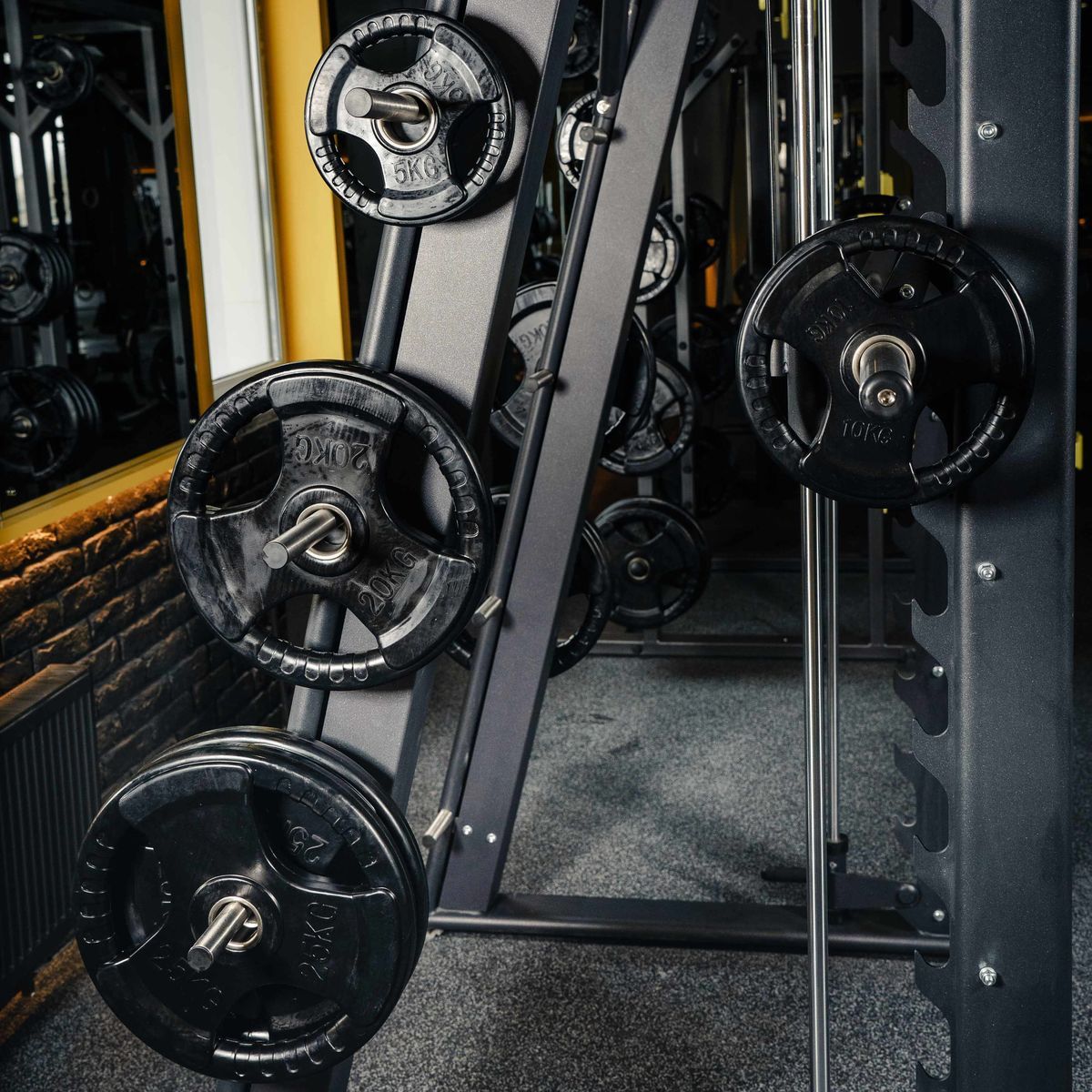 На раме тренажера закреплены 16 металлических накопителей для хранения свободных весов, оборудованных кольцами из плотной резины для предотвращения механических повреждений при соприкосновении дисков с рамой.