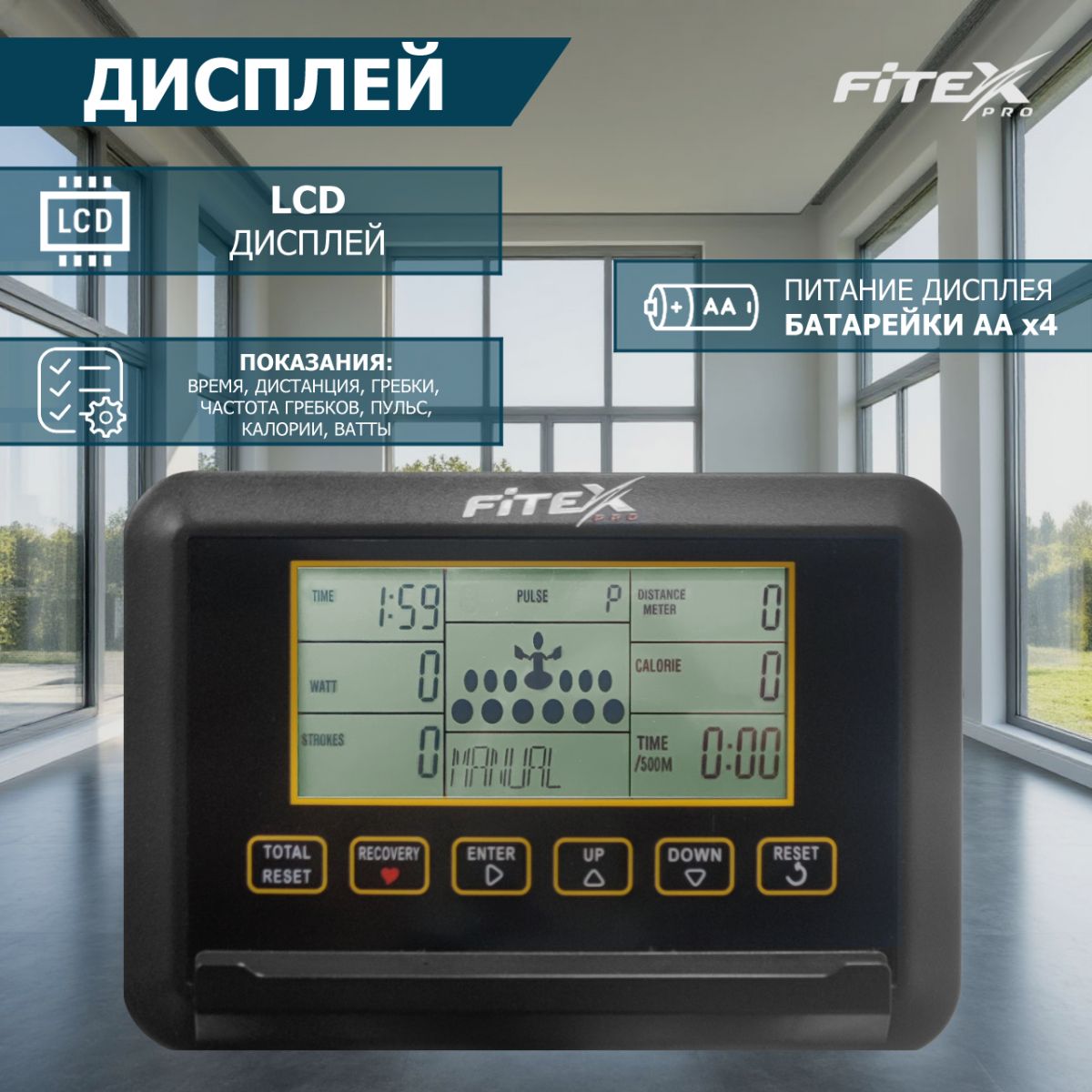 | Показания консоли | Время, дистанция, гребки, частота гребков, пульс, калории, ватты, |