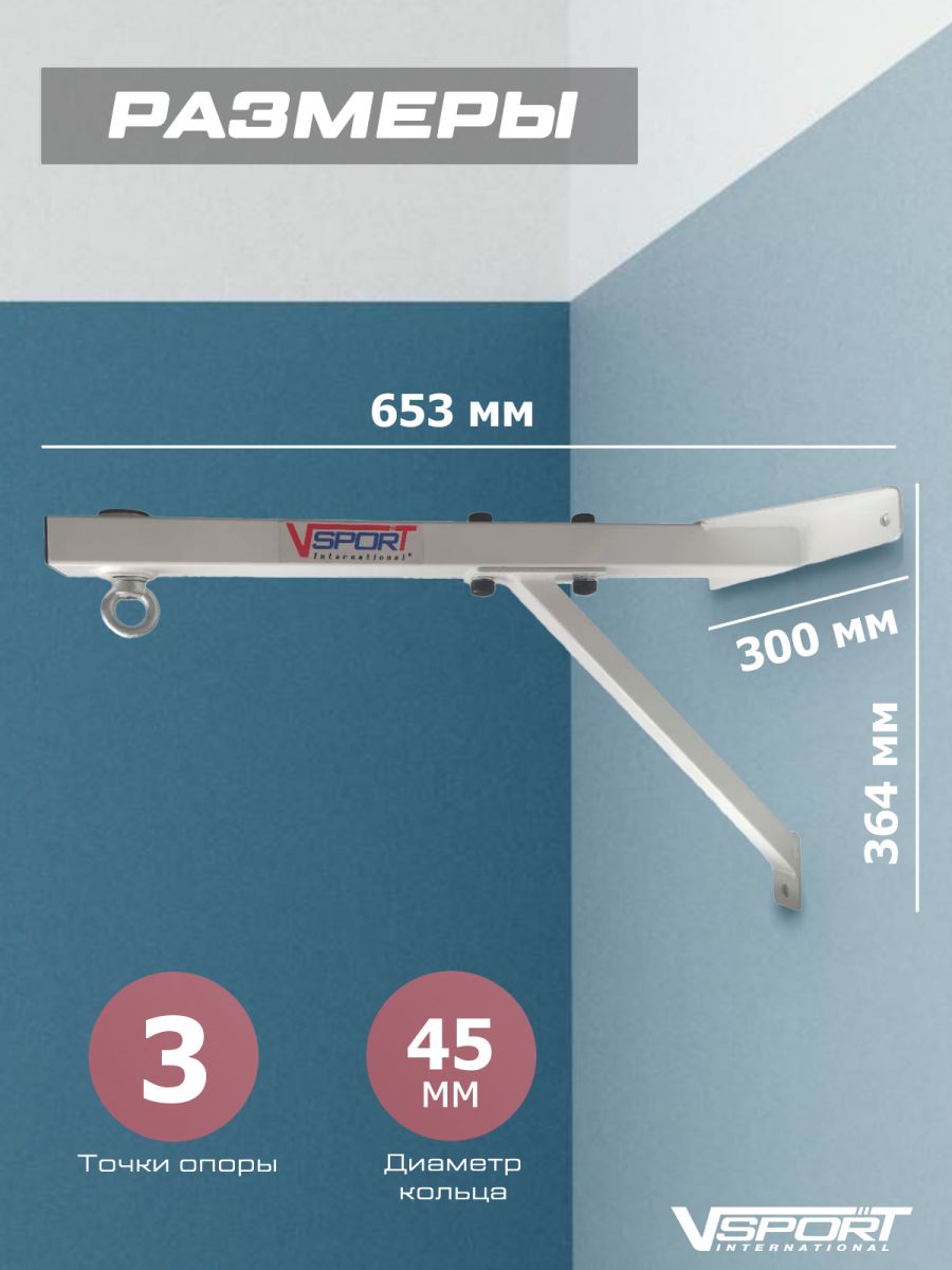 Универсальный настенный кронштейн/подвес для вывешивания боксерского мешка или боксерской груши. Предельная нагрузка на конструкцию до 80 кг. Кронштейн имеет три точки крепления к стене. Вынос кронштейна от стены — 65 см. Петля для мешка вращающаяся. Вынос обеспечивает широкую зону тренировки для отработки ударной техники руками и ногами. Цвет окраски металла — белый/серый металлик. Пластиковая фурнитура — цвет черный. Поставляется в разобранном виде. Одна коробка.