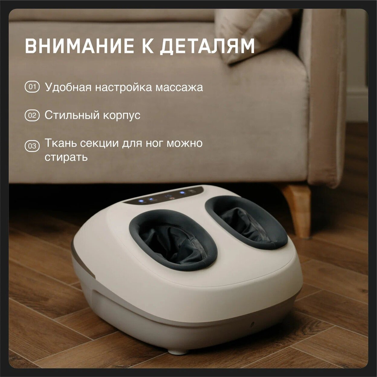 В массажере установлен сложный роликовый механизм для тщательного массажа без слепых зон. Он состоит из платформы с роликами, которая разминает большую часть ступни, и массажного барабана для массажа пальцев и области под ними. У роликовой массажной системы есть 3 уровня интенсивности.
