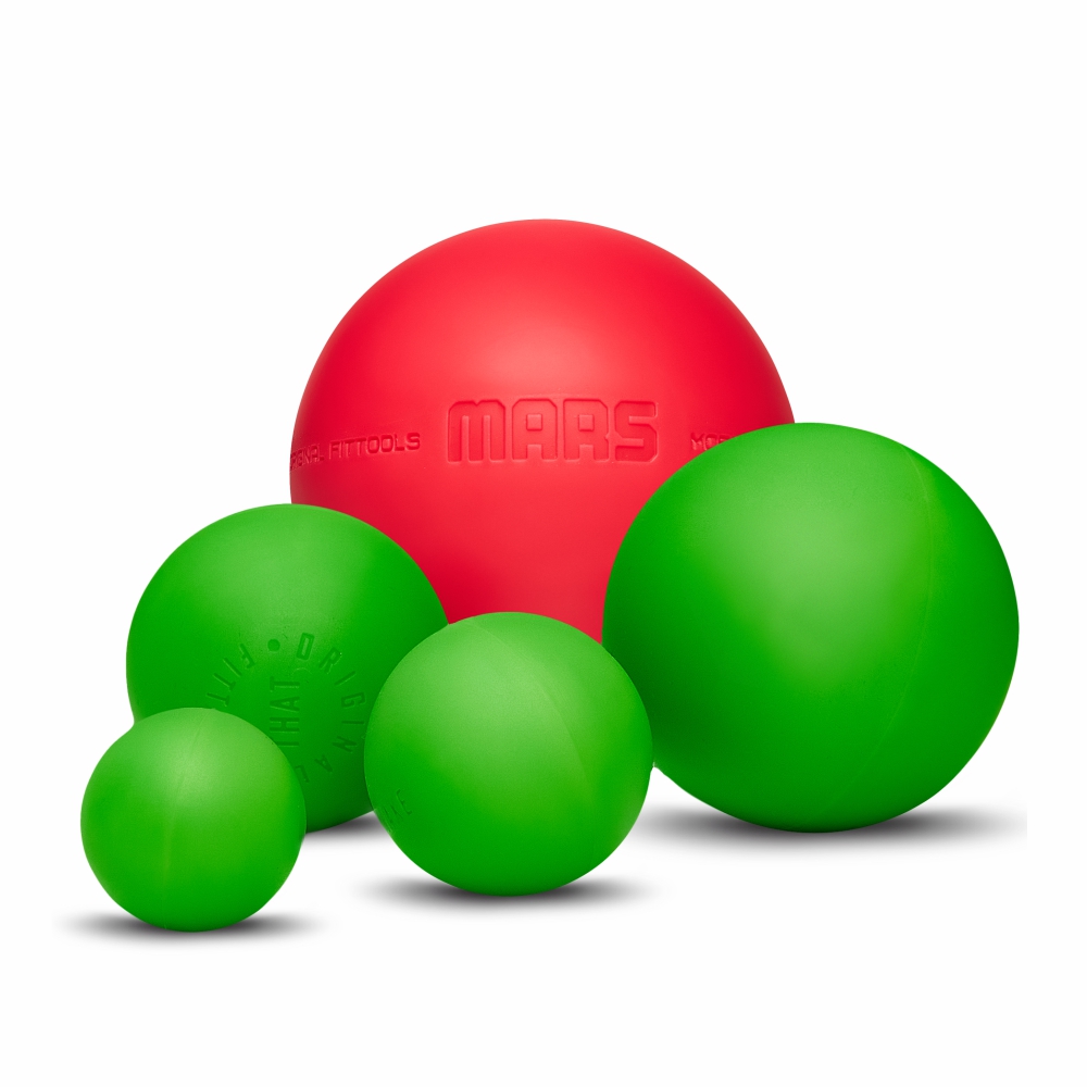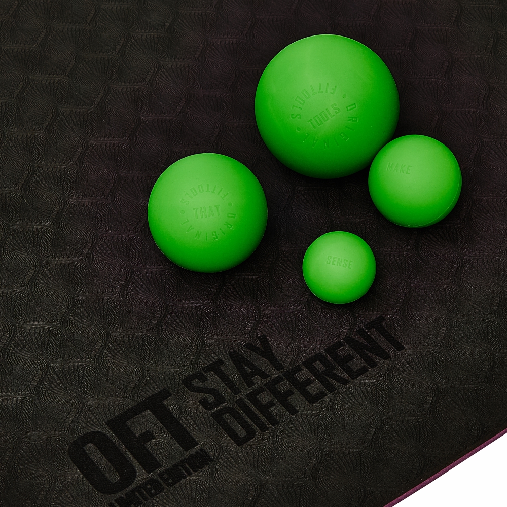 - Вес мячей OFT: 147 г (6,3 см), 74 г (5 см), 37 г (4 см) и 16 г (3 см) — весовая разница отражает плотность и прочность каждого массажного мяча.