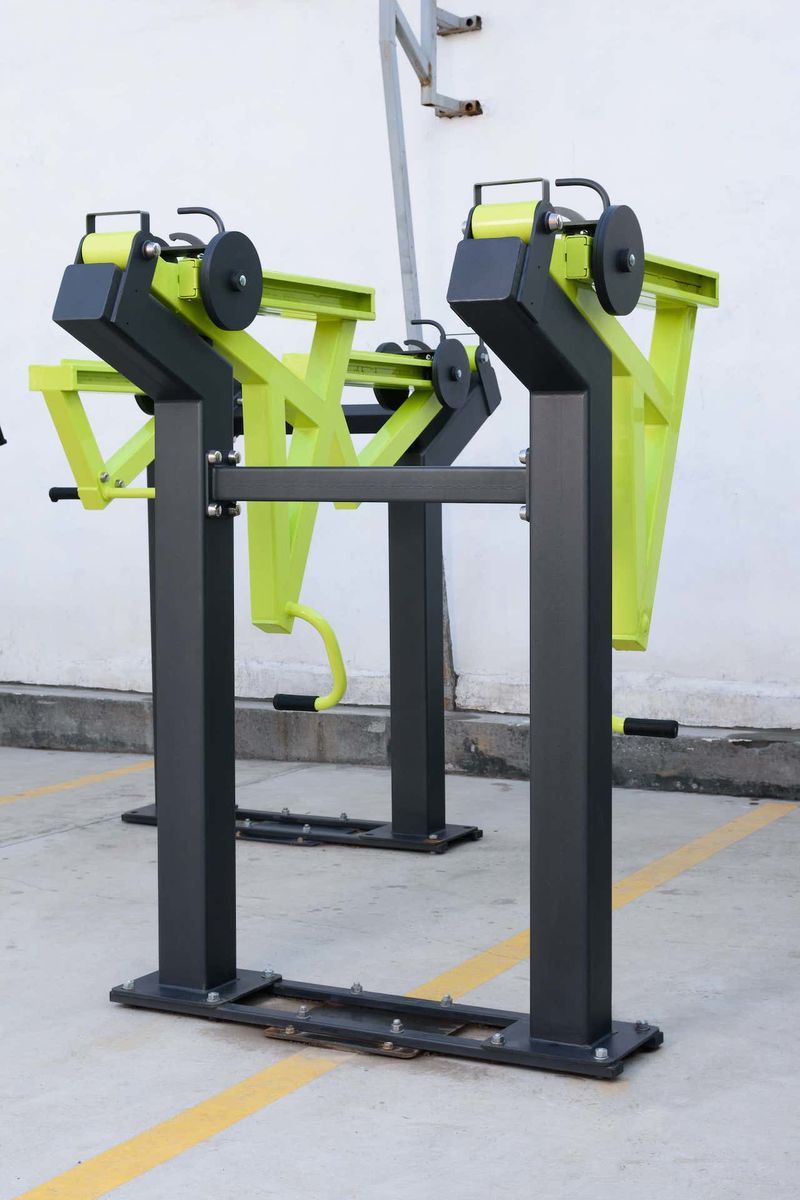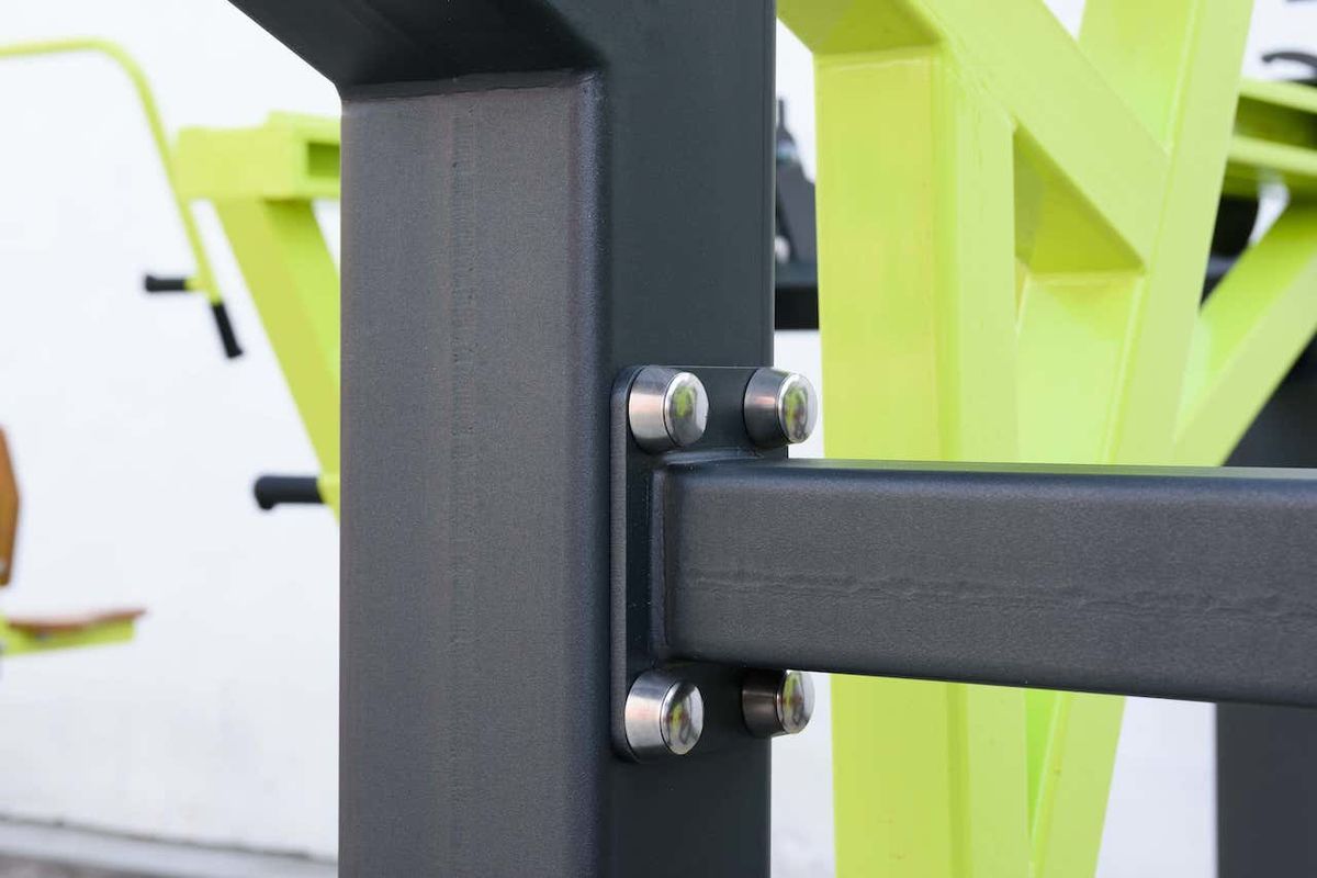 Надёжность и прочность разъёмных соединений конструктивных элементов тренажёра обеспечиваются за счёт использования высококачественного оцинкованного крепежа, выступающие части которого закрыты металлическими защитными колпачками.