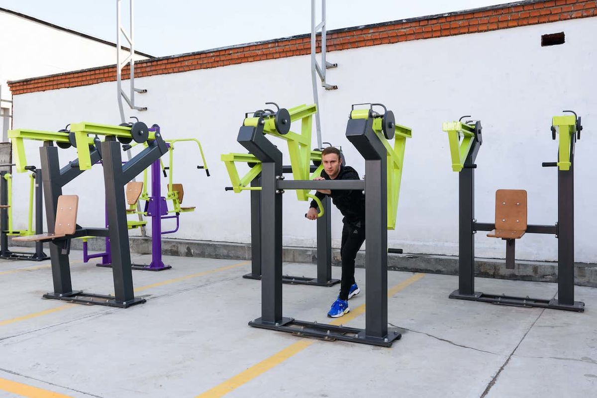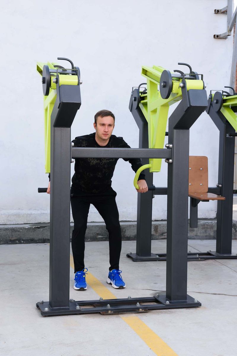 Несущая конструкция уличного тренажера выполнена из профильных труб 140×140 с толщиной стенки 5 мм. Детали изготовлены из листового металла толщиной 8 мм, 4 мм и 3 мм.