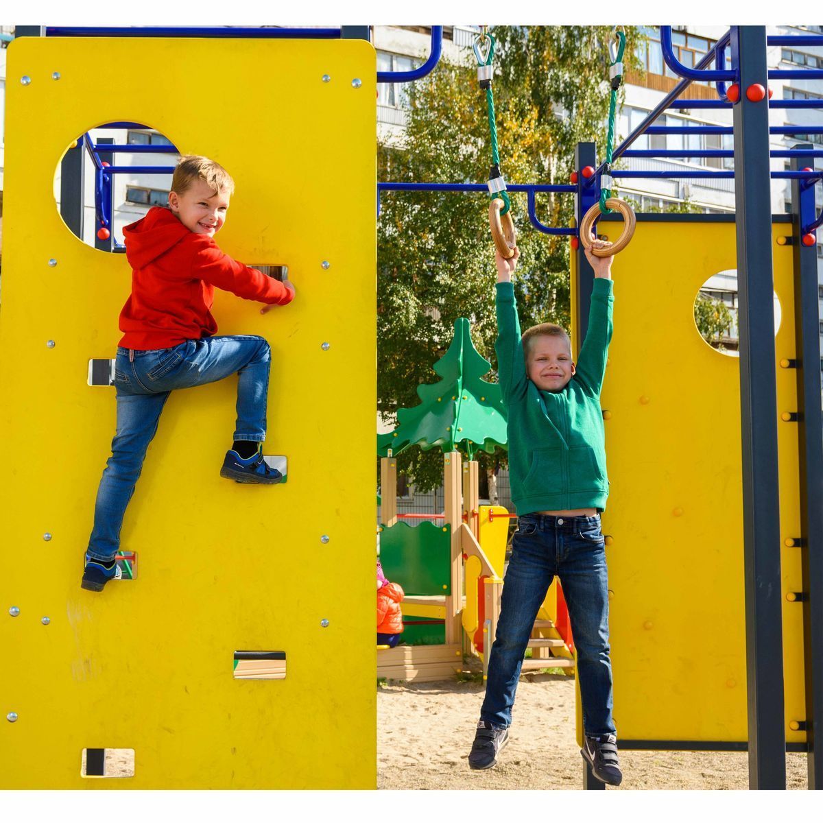 Конструкция комплекса рассчитана на круглогодичное использование и безопасна для детей. Оптимально подобранное сочетание спортивных снарядов – шведская стенка, турники, брусья, рукоходы, кольца, канат и скалодром – создаёт условия для гармоничного физического развития ребёнка: укрепления мышц, развития координации, ловкости и силы.