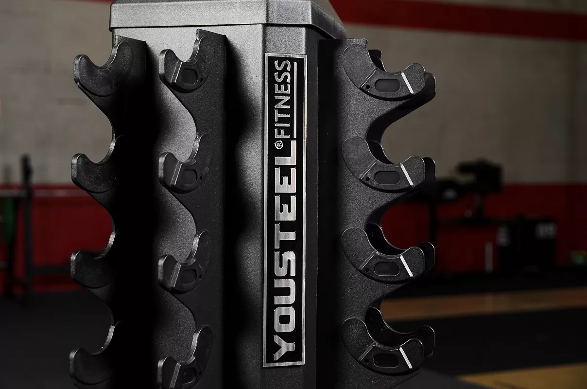 Стойка способна вместить 10 пар гантелей, весом от 1 до 10кг. Ложементы обрамлены пластиком и предотвратят повреждения рукоятей гантелей. Это отличный компактный вариант с габаритными размерами 450х257х1387мм