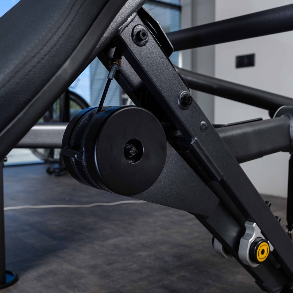 Прорезь в защитном кожухе грузоблока для доступа к регулировке нагрузки шлифованная с завальцованными внутрь гранями по всему периметру для безопасного доступа к весовому стеку и обеспечения дополнительной жёсткости рамы грузоблока.