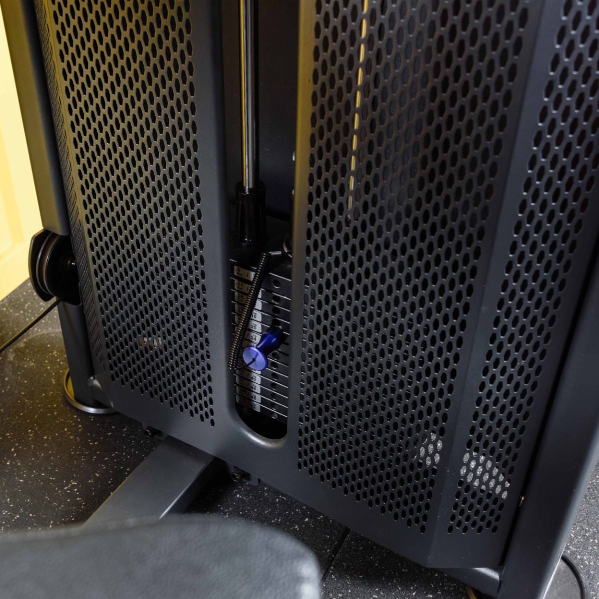 Металлическая, перфорированная защита весового стека с обеих сторон, выполнена из листового метала толщиной 2мм, с ребрами жесткости у основания, примыкает к несущей раме через скрытое болтовое соединение сечением 6мм в 8 точках, что повышает эстетические и эксплуатационные параметры тренажера.