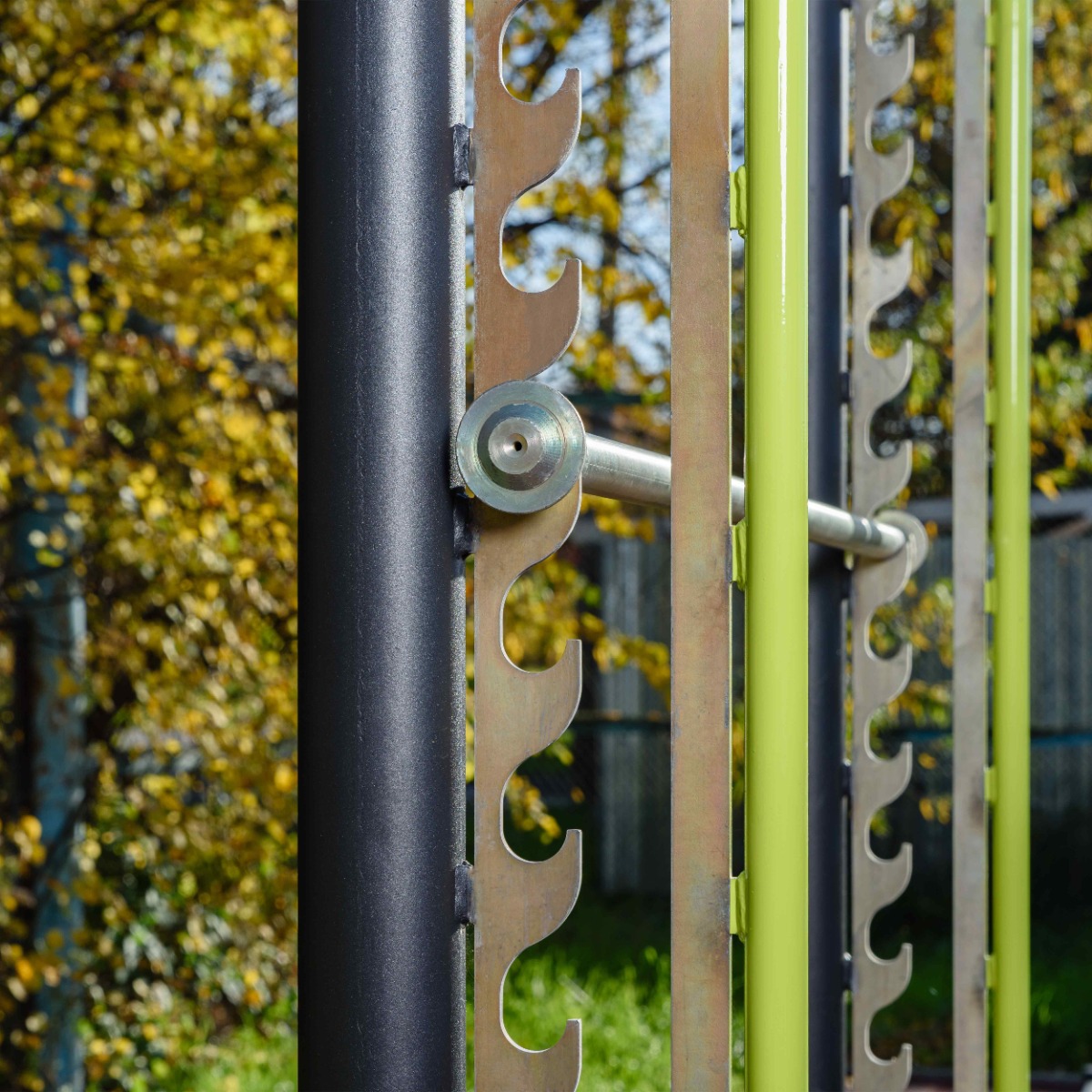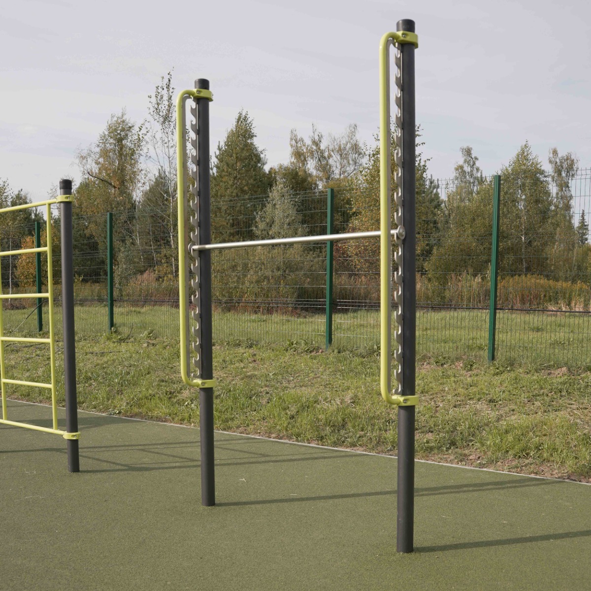 Вертикальные ограничители и турник-перекладина выполнены из металлической трубы диаметром 34 мм с толщиной стенки 3,2 мм.