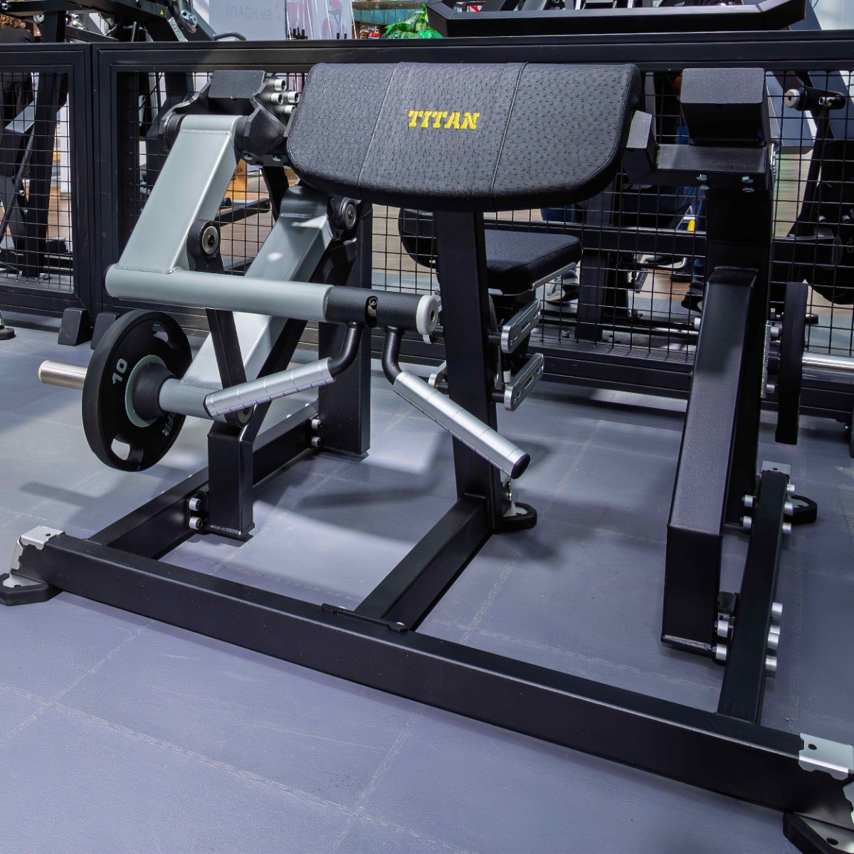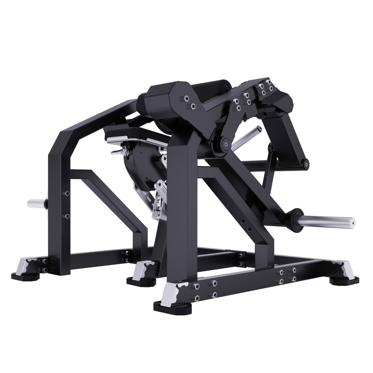 На подвижном рычаге для работы со свободными весами установлен один литой хромированный накопитель из толстостенной стальной трубы для дисков с посадочным диаметром 50 мм.